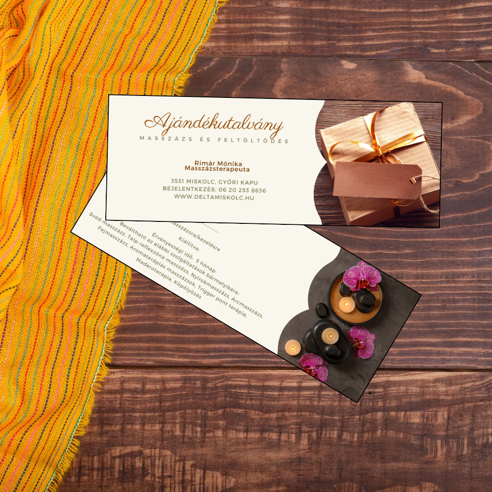 Ezzel az ajándékutalvánnyal a megajándékozott szabadon választhat a Delta Masszázsterápia 60 vagy 90 perces masszázsai, illetve a 4 és 8 alkalmas bérletek közül. A pontos típust és értéket a legördülő menüben tudod kiválasztani.