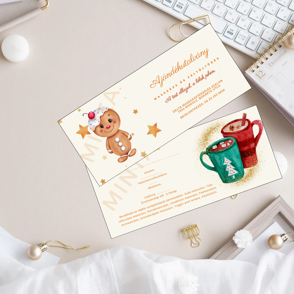 Lepd meg szeretteidet egy különleges ajándékkal! A Mézi masszázsutalvány egy aranyos mézeskalács figurát ábrázoló, limitált karácsonyi ajánlat, amely LD boríték méretben (110×220 mm) készül, így tökéletesen nyomtatható vagy elegáns borítékban átadható.
